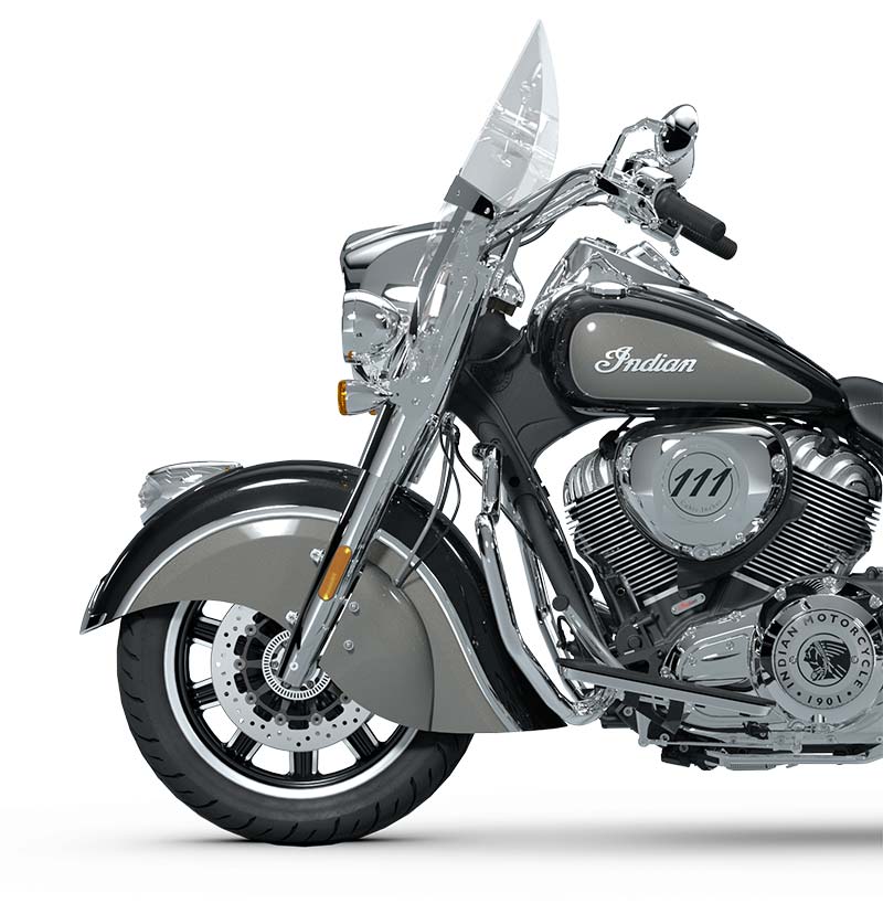 | Standard Equipment | Quick Release Windshield; Genuine Leather Seat; Remote-Locking Hard Saddlebags, Highway Bars; Tyre Pressure Monitoring; Light Bar; Selectable Ride Modes, ABS; Cruise Control; Keyless Ignition; Indian® Script Tank Badge; 12v Charging Port |